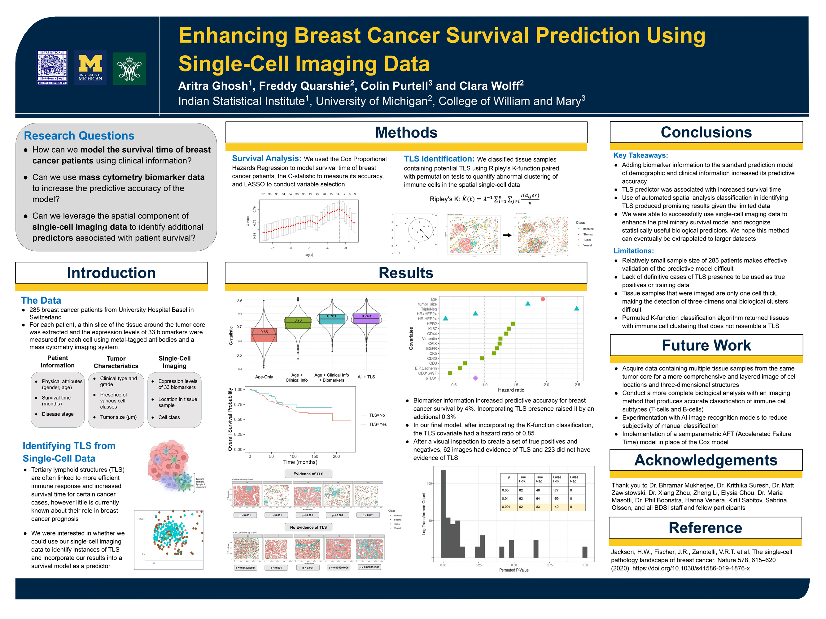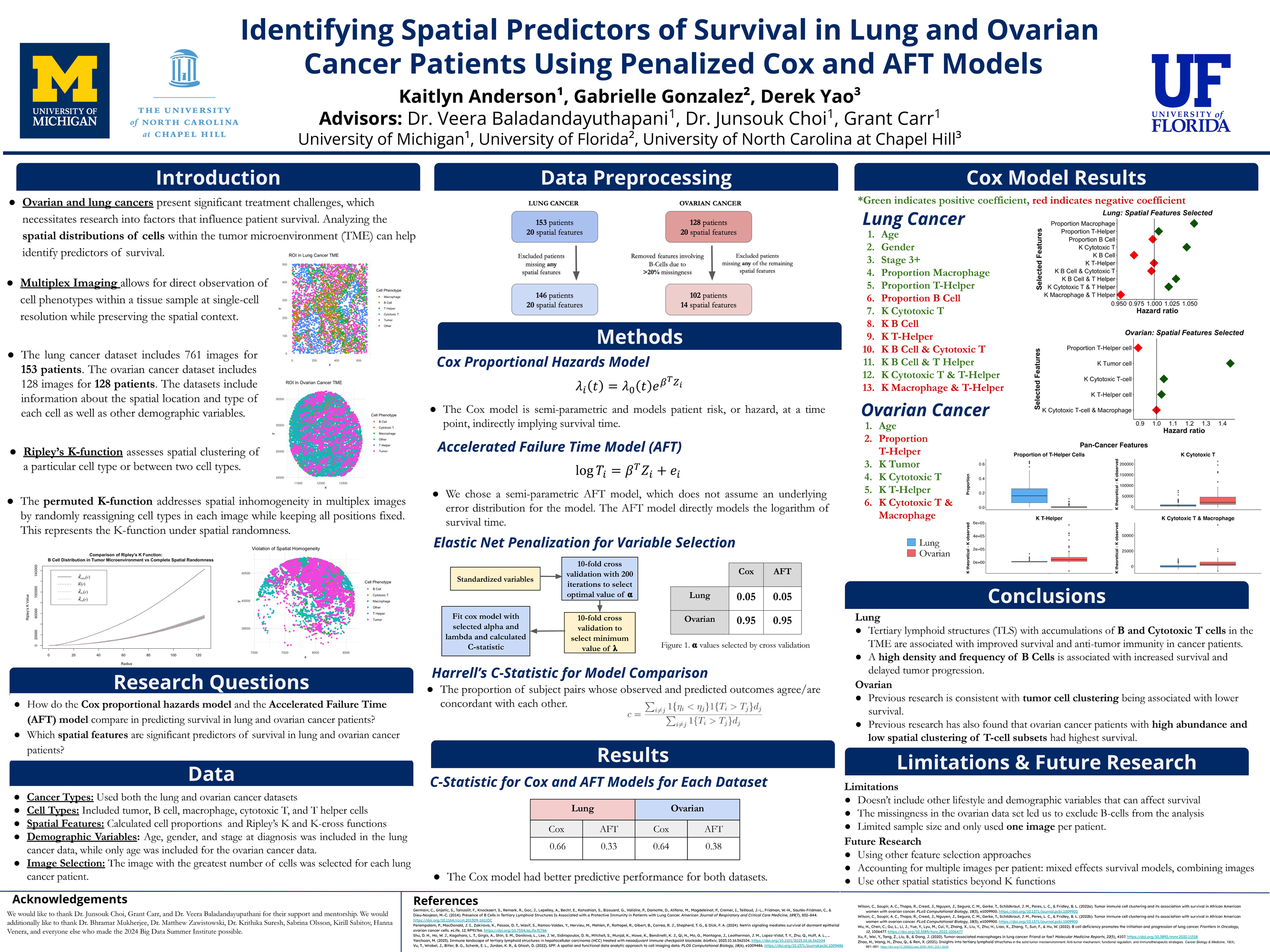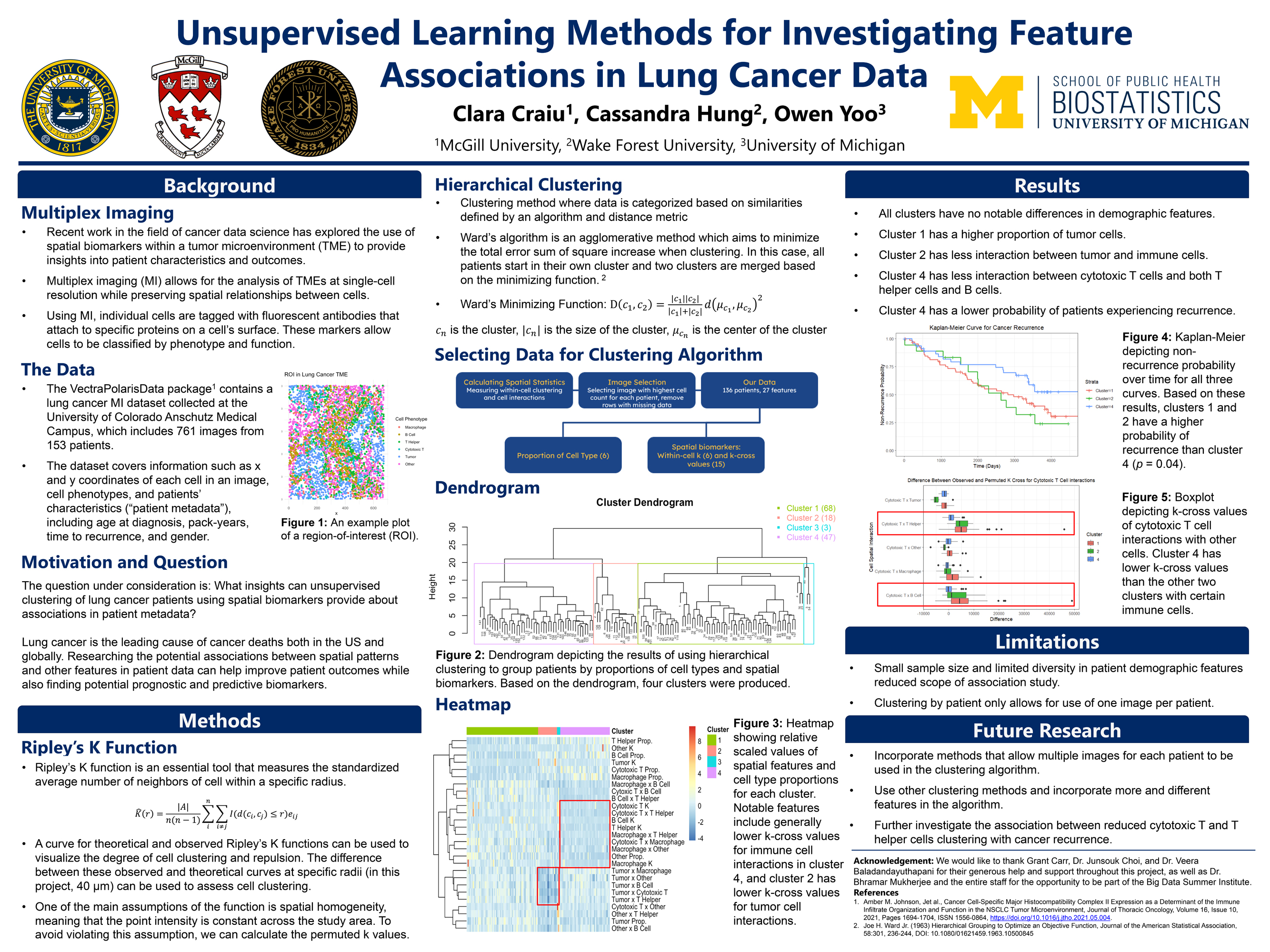 The Cancer Data Science group will delve into statistical, computational, and mathematical questions that arise in cancer research. The research project will involve an application to advancing cancer prevention and care. Examples include developing predictive models to assess recurrence risk based on clinical, genomic, or pathological data; investigating spatial and temporal dynamics of tumor evolution using genomic and medical imaging data; leveraging clinical data to identify biomarkers associated with tumor initiation and progression, and much more. Student teams will initiate novel research questions using the provided data sources and conduct in-depth analysis to explore these questions. This immersive experience will teach students valuable skills in data manipulation, statistical computing, and data visualization. Within this research group, students will have a chance to engage with members of the UM Cancer Data Science group and learn to apply advanced statistical methods, such as survival analysis, machine learning, and spatial data analysis.