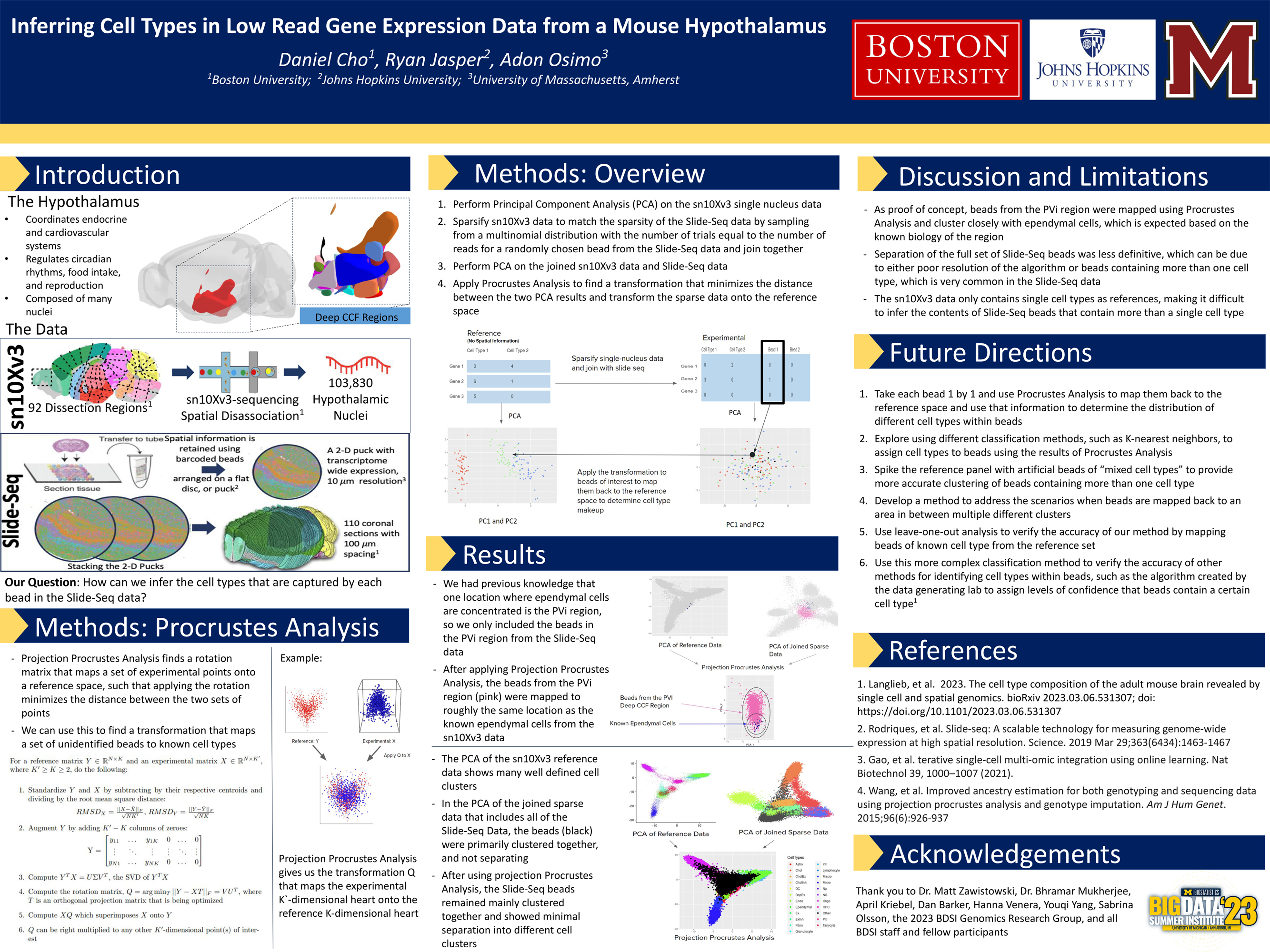 BDSI participants are split into research teams of 10 students to focus on a specific biomedical or public health application. Each team has at least one faculty mentor and one graduate student research assistant to facilitate the project work. Participants are assigned to research groups based on indicated preferences and skill sets. The specific aims and datasets are chosen closer to the start of the program.